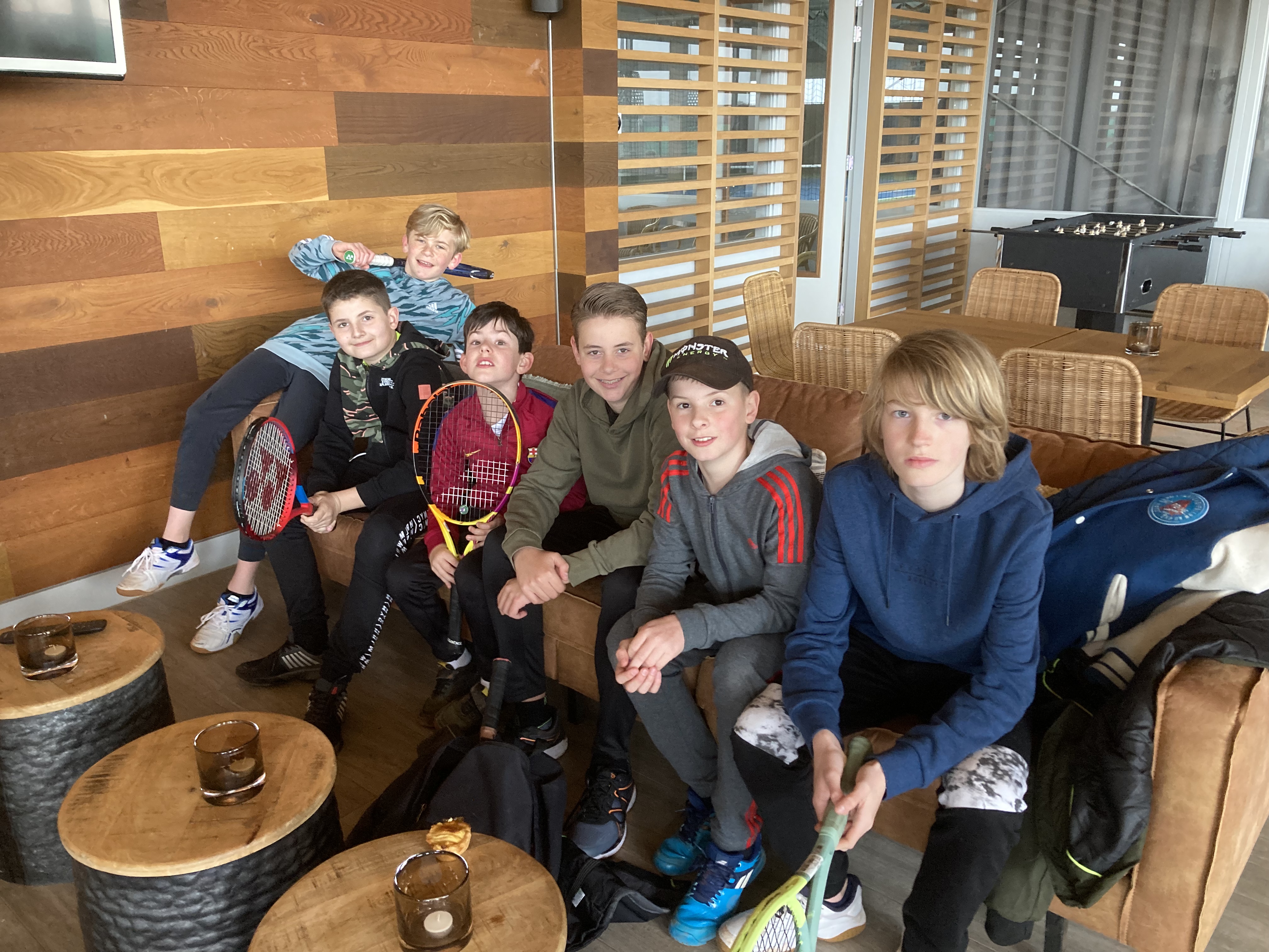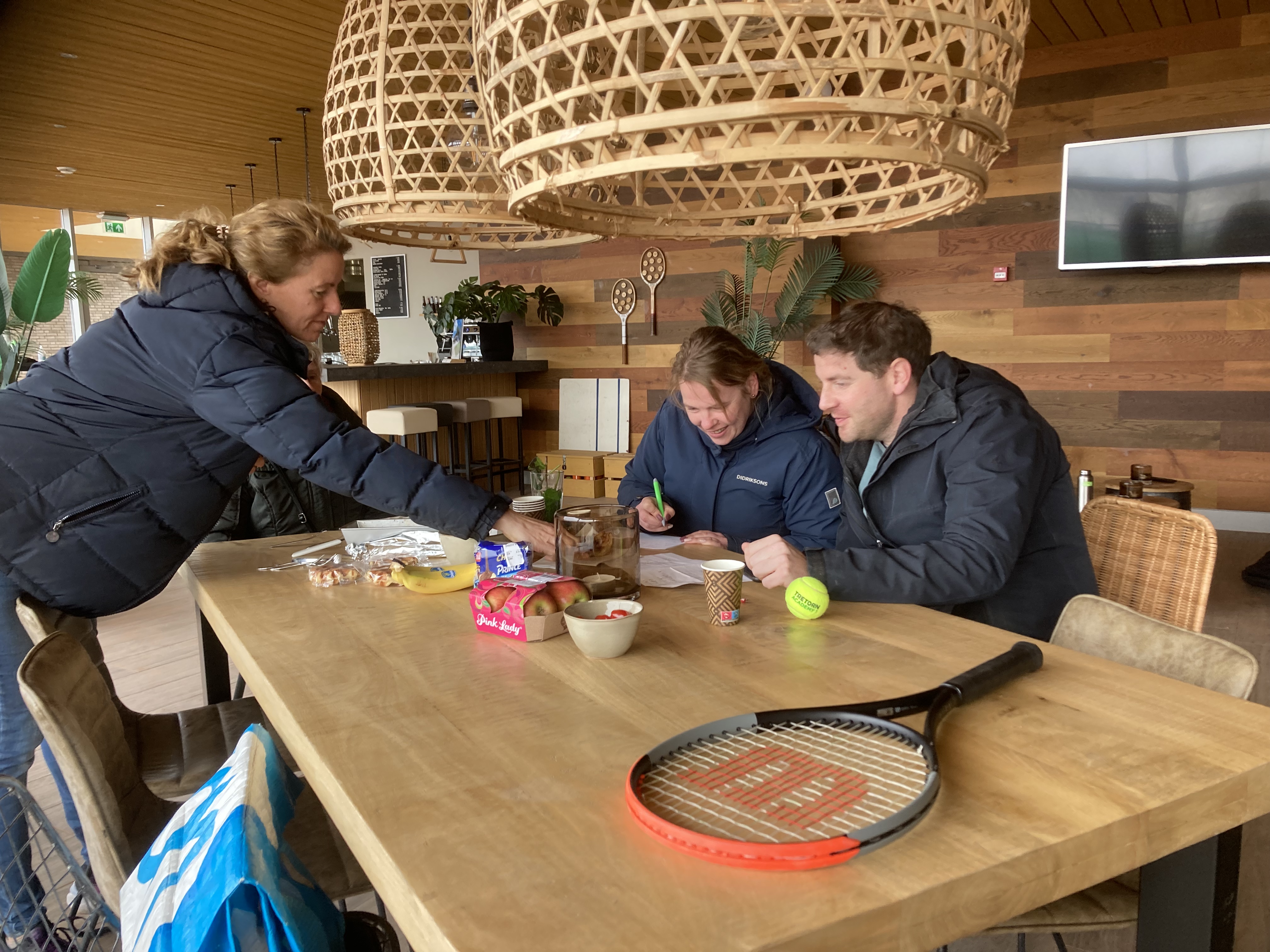 Om 9 uur ging groen van start, na ontvangst door Arjan en een warming up door de trainer van RG sports. Op de foto's rusten de groene mannen lekker uit van hun 6-0 zege op Hoogerheide terwijl de ouders de scores bijwerken, zodat Arjan en Marjolein ze in kunnen voeren. Groen speelt om twee gewonnen sets, bestaande uit vier games. De derde set is een tiebreak. Er worden 4 enkels en twee dubbels gespeeld. En die werden dus allemaal gewonnen 🥇