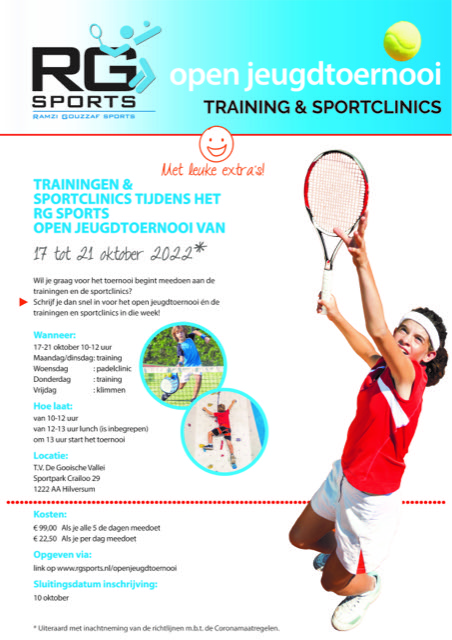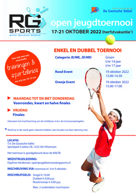 Onze tennisschool RG Sports organiseert in de herfstvakantie een tennisweek voor de jeugd op het tennispark van TV de Gooische Vallei in Hilversum. We bevelen dit van harte bij al onze jeugdleden aan. Van wedstrijden tennissen word je beter en het is heel erg leuk!