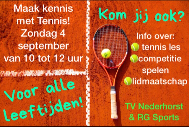 Op zondag 4 september kan jong en oud kennis maken met TV Nederhorst en RGsports. Van 10 tot 12 uur zijn er trainers en leden van de club aanwezig om je alle info te geven over allerlei zaken zoals : tennis lessen, competitie spelen en lidmaatschap. Dus heb je altijd al eens meer willen weten over tennis of wil je gewoon even een balletje slaan? Dit is je kans, trek je tennisschoenen aan en neem je racket mee. Geen racket? Geen probleem die hebben wij voor je klaar liggen!