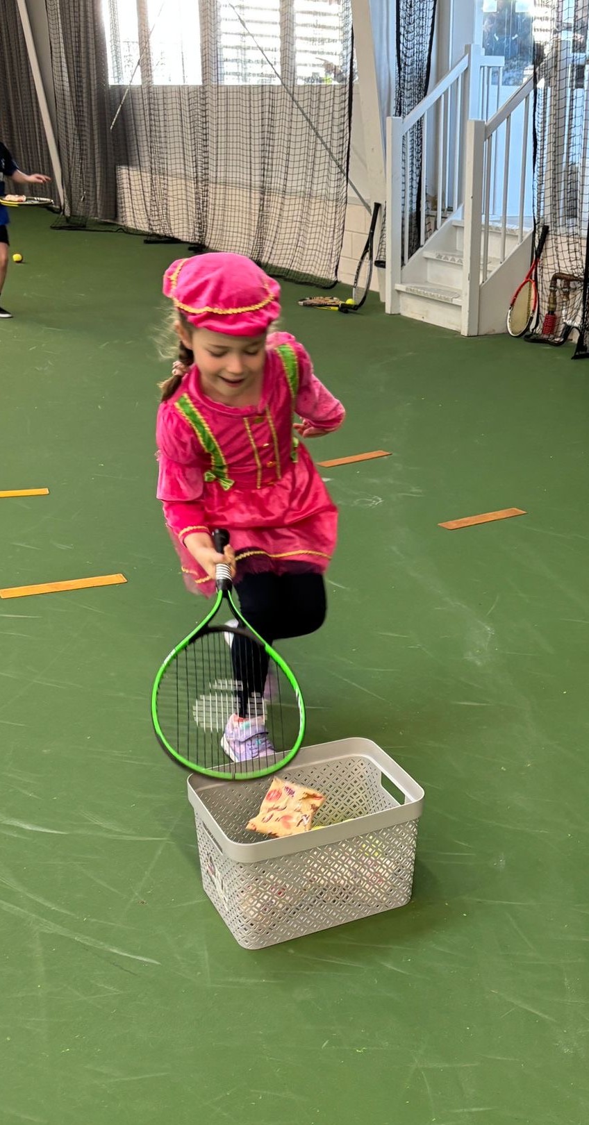 De tennis-pieten stonden in al hun vrolijkheid de kinderen (en hun broertjes en zusjes) van de rode en oranje groep op te wachten om ze vervolgens snel mee te nemen naar de tennisbaan.