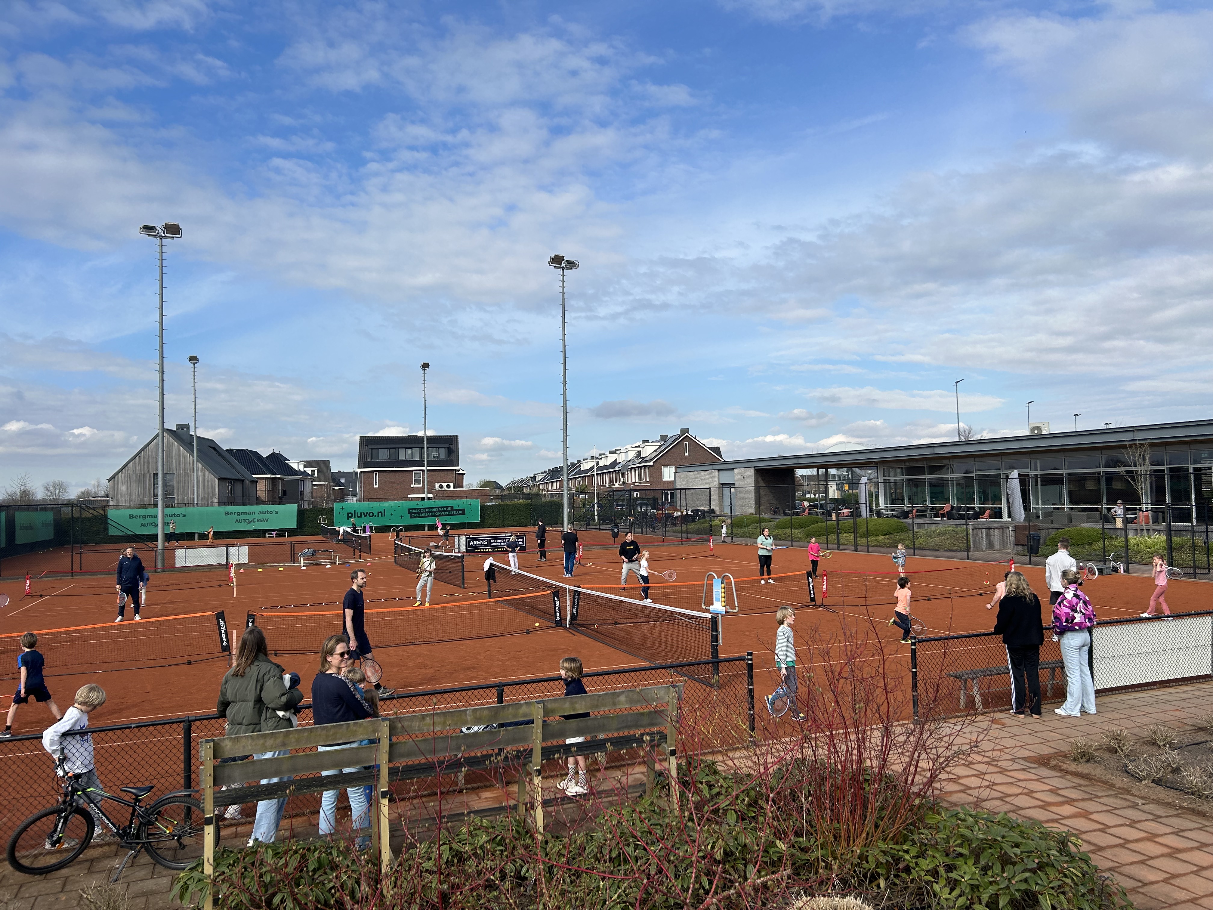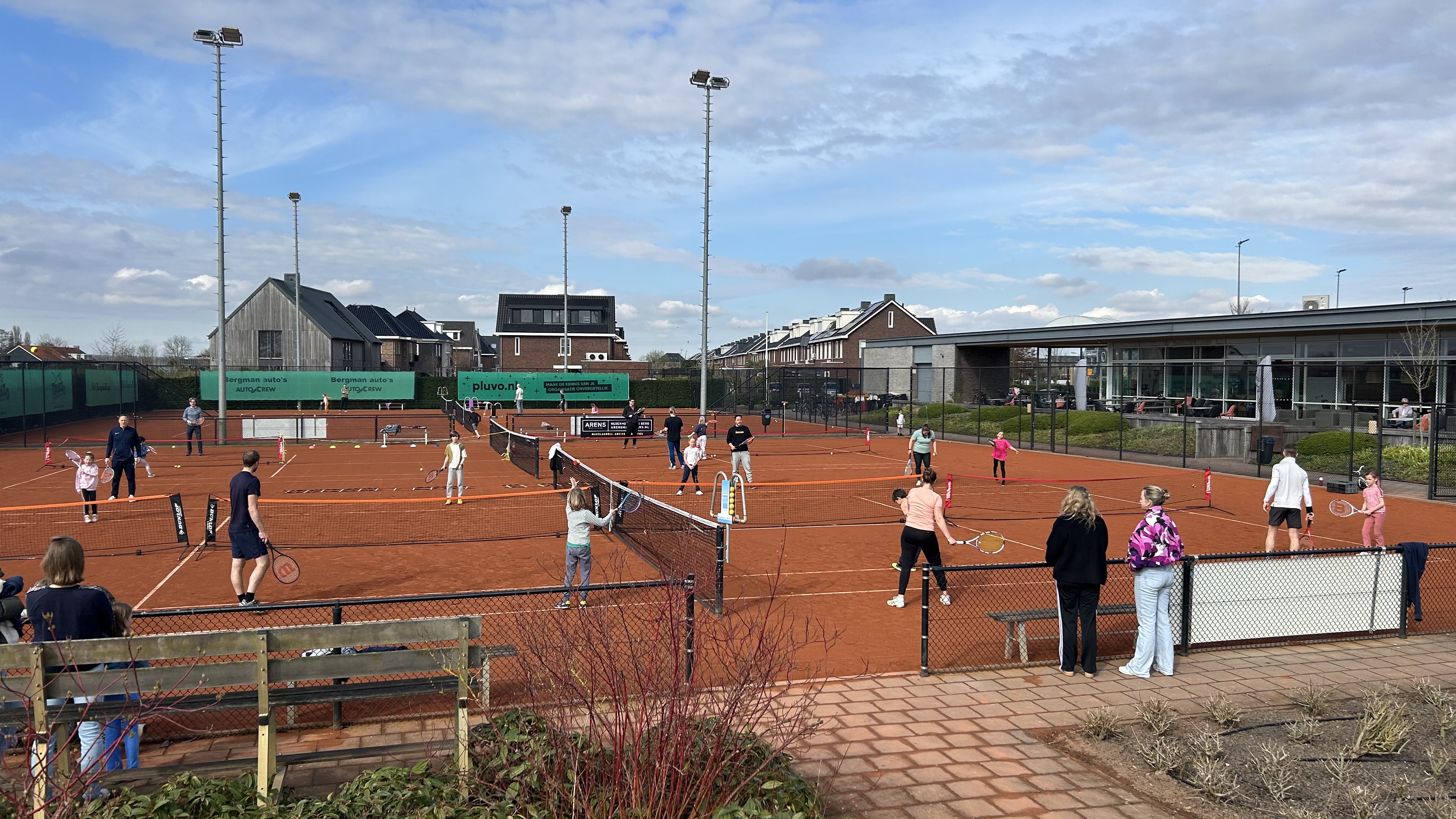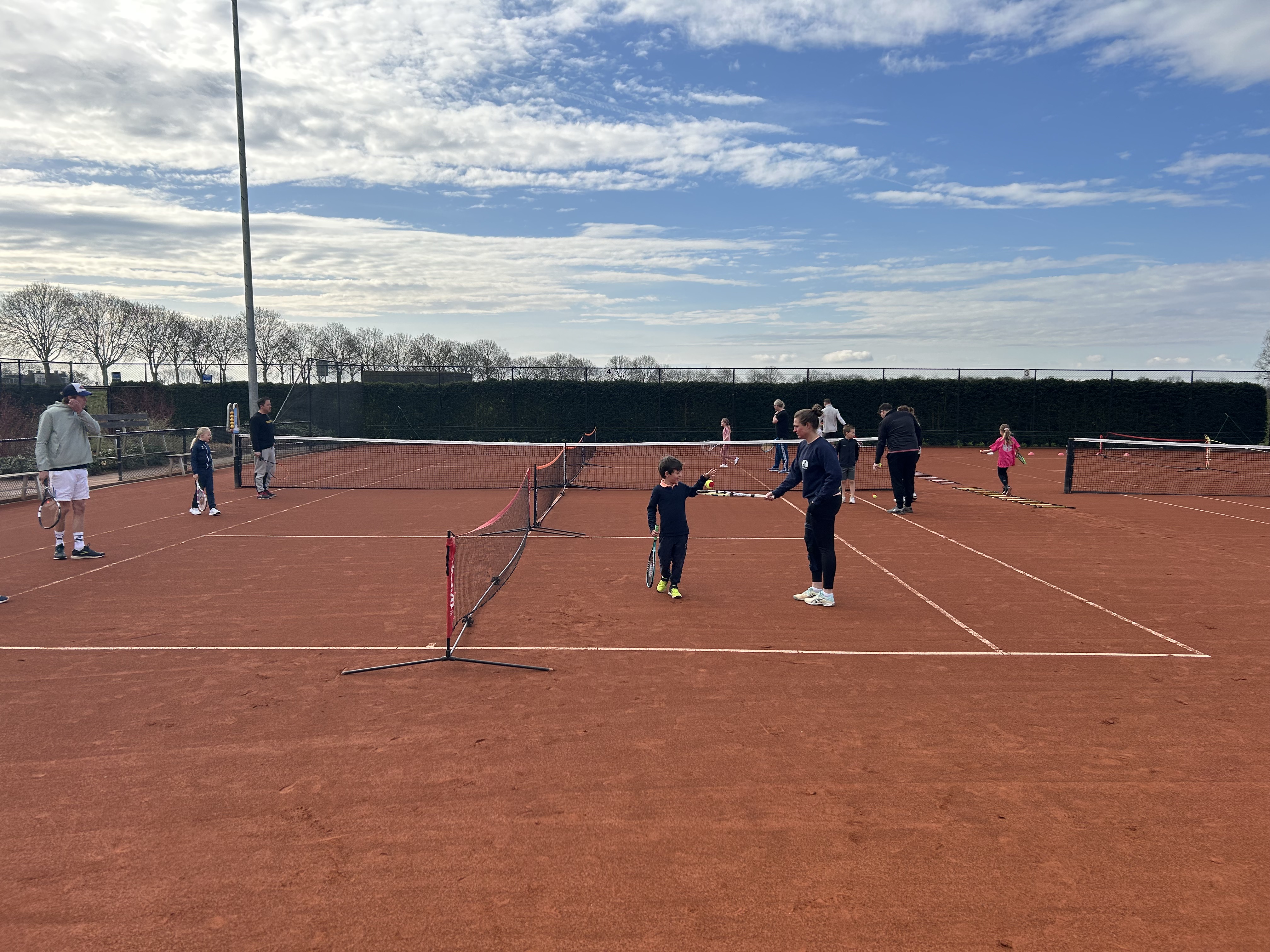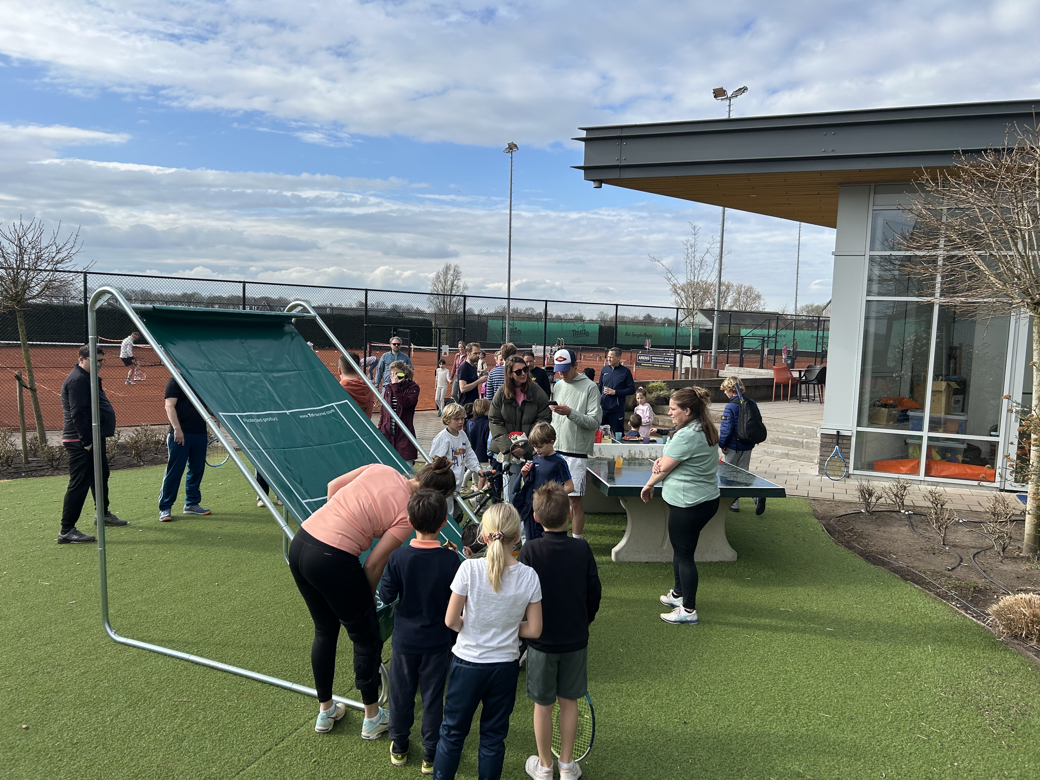 De rode en oranje kids tossten samen met hun ouders en op baan 5 speelden de groen/gele toppers. We zouden een uurtje tennissen, maar na twee keer een half uur, inclusief pauze met limonade en lekkers, hadden de kids er nog lang geen genoeg van en tennisten ze vrolijk verder.