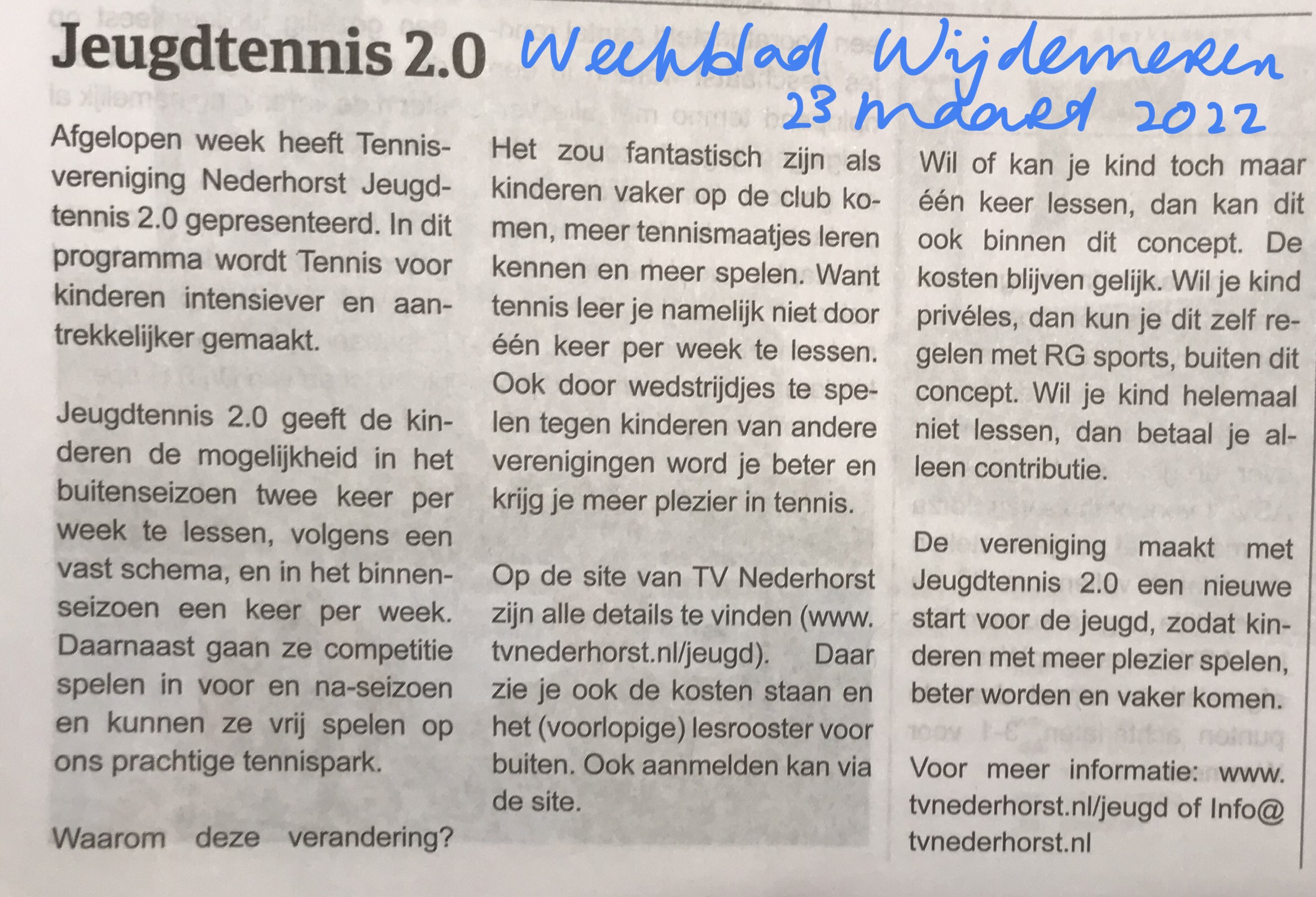 Vanaf volgende week beginnen we met Jeugdtennis 2.0. Wil je er meer over lezen, kijk dan even op onze website bij Jeugd. En om veel kinderen enthousiast te maken, zoeken we ook de publiciteit: een voorlichtingsavond voor ouders, een artikeltje in Weekblad WIjdemeren, een bijgewerkte website en ook het bord aan de buitenkant van het park wordt aangepast.
