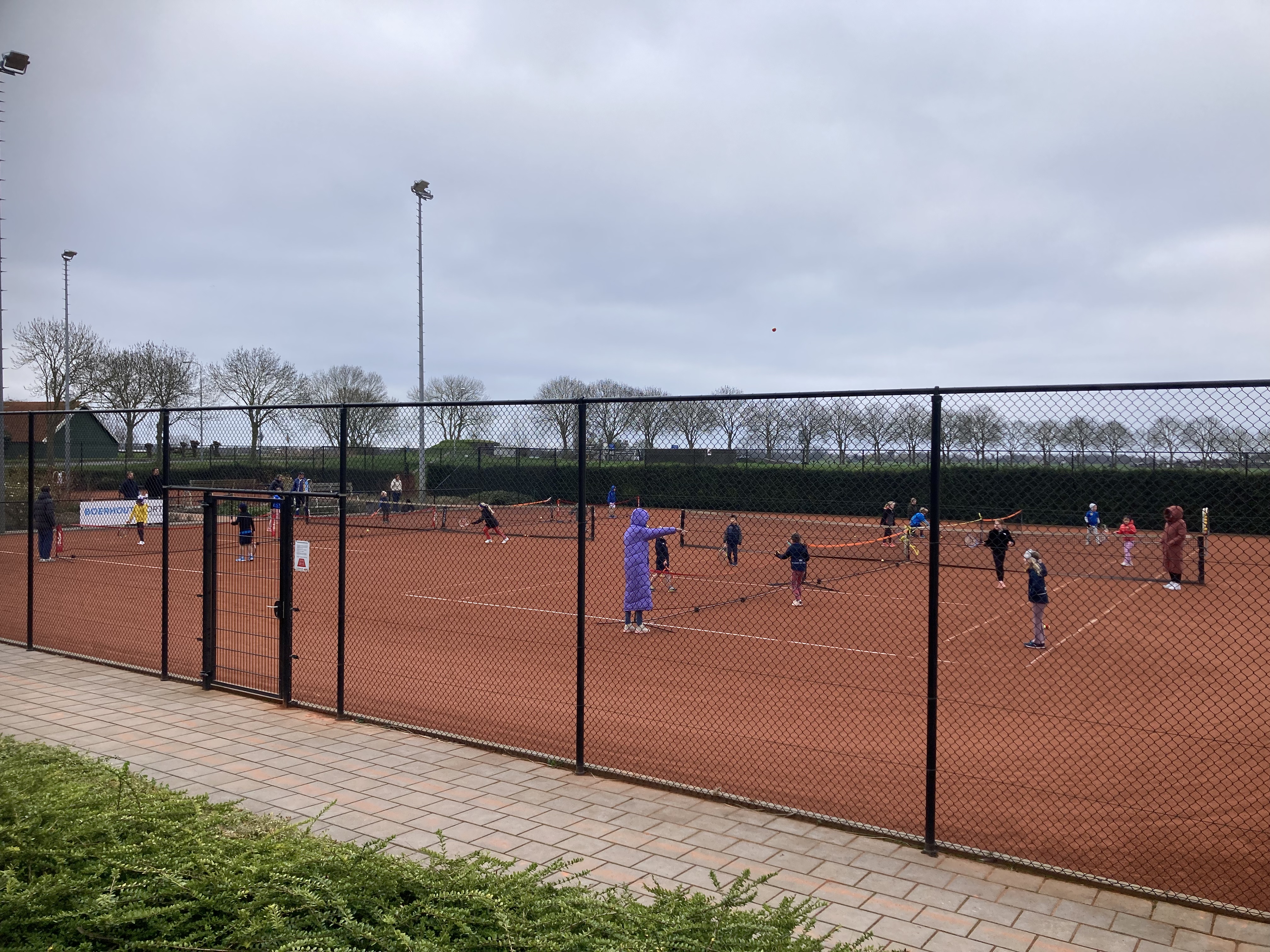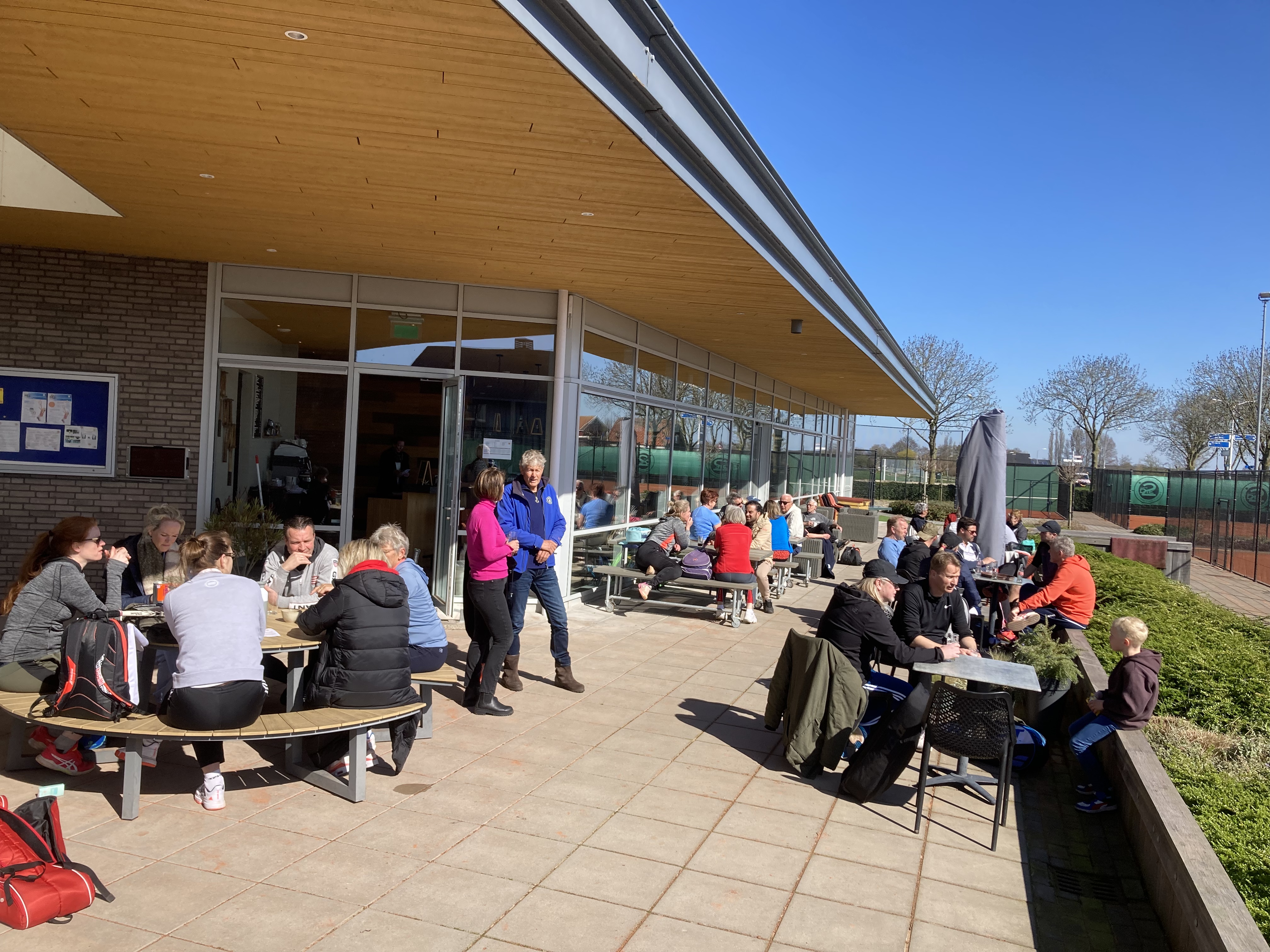 Om twee uur begon het openingsevenement. 26 leden hadden zich ingeschreven, half uurtje spelen, kuiltjes trappen, slepen en kwartiertje rust. De zon scheen uitbundig en op het terras was het uitstekend toeven. Er kwam zelfs publiek! Onder leiding van Bob, Arjan en Famke genoot iedereen van buiten zijn, tennis, zon en de door Hanneke en Trienke geserveerde hapjes en drankjes.